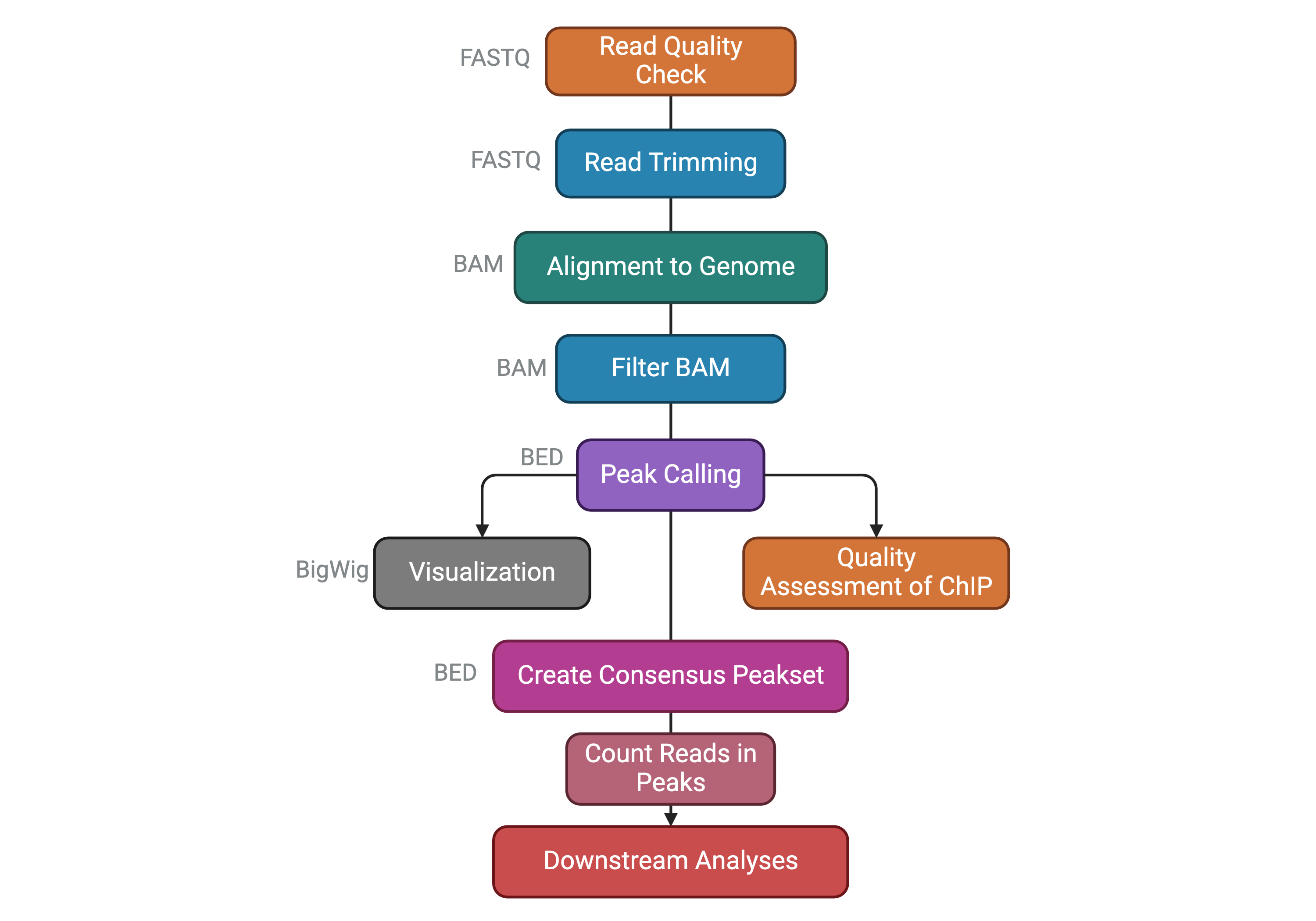 Before going on, let’s summarize the steps of a ChIP-seq analysis workflow that we have seen so far with the following scheme. You can find the file format names associated to the output of each task.