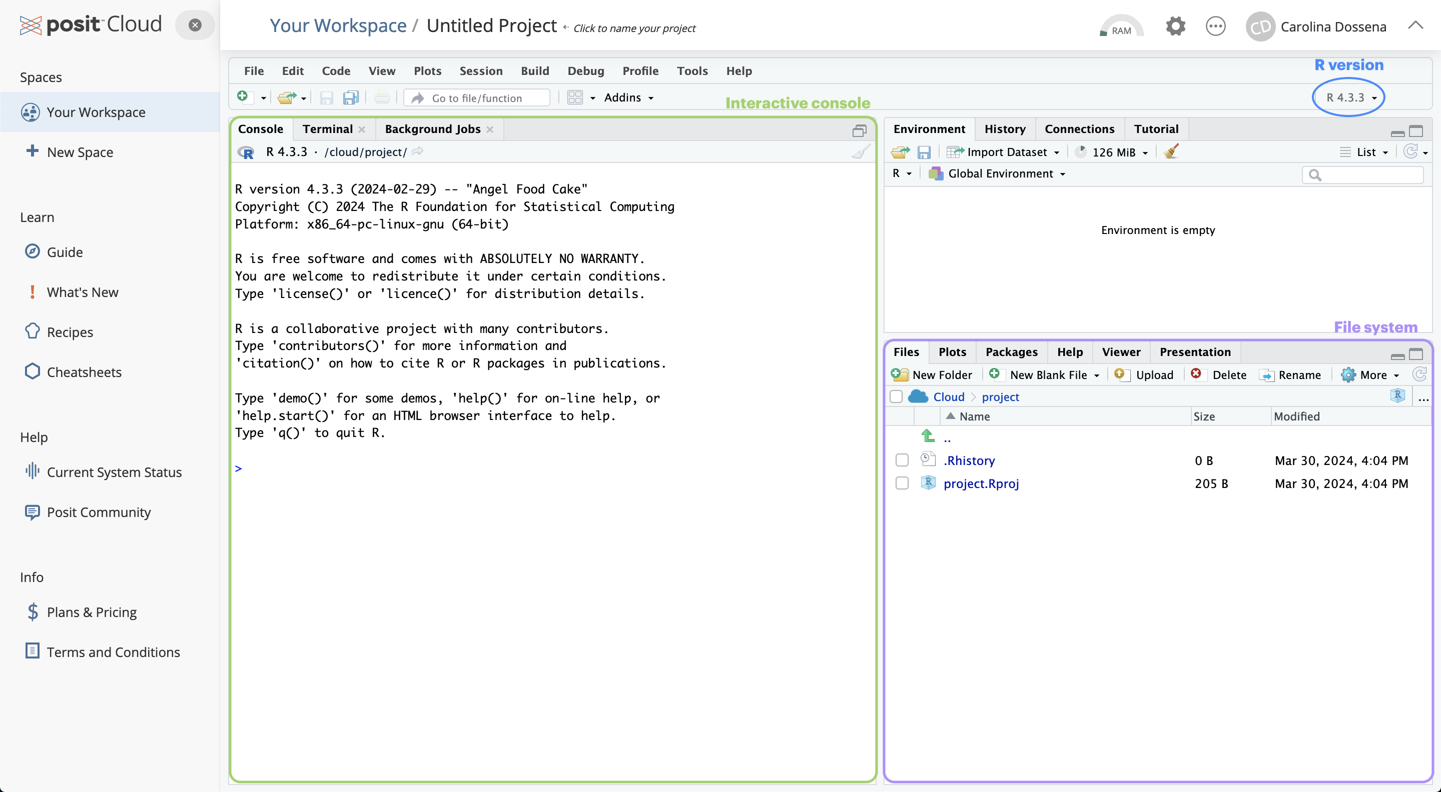 The Files / Plots / Packages / Help / Viewer window: located in the bottom-right, it displays your current file system (on the Cloud), which is pointed to the position where your Rproject you just created lives.